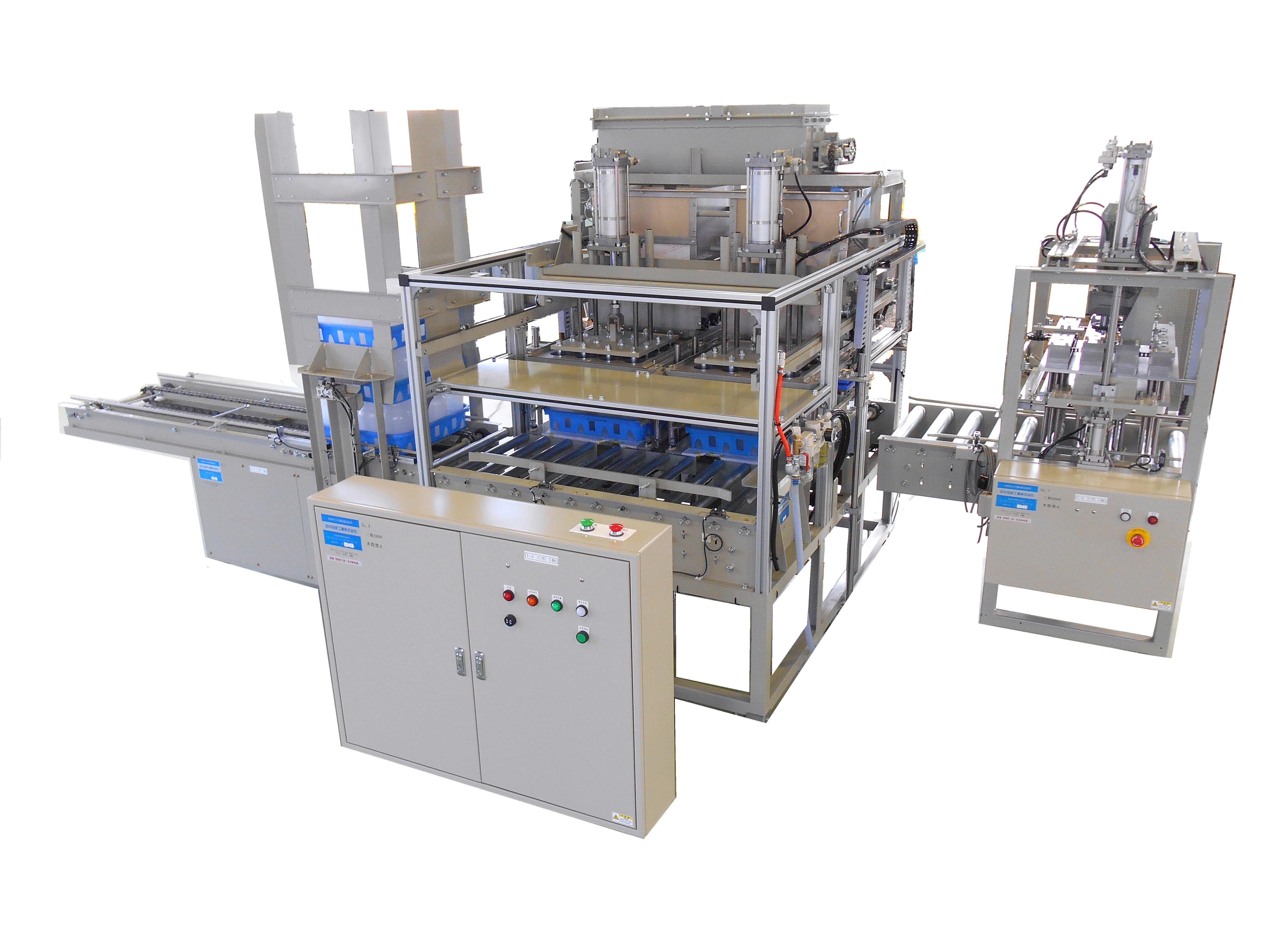 きのこ栽培瓶に培地を詰め込む自動機です。 振動をさせながら均等な重量の培地を瓶に詰め込み、床面に種菌を落とす穴を成形します。 原料のビン詰めから穴あけの作業工程を1時間に4500本の処理能力で行います。
